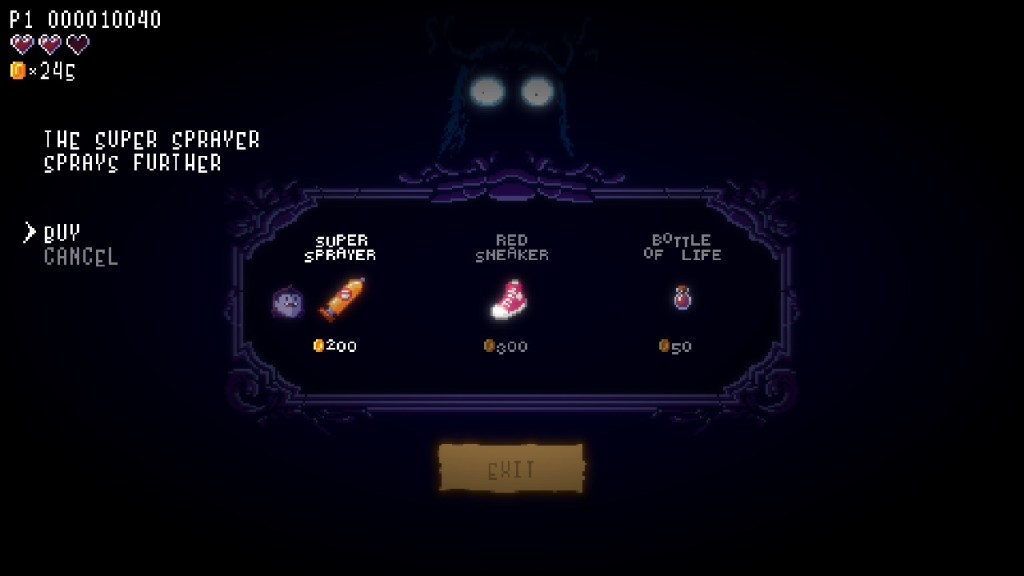 You only have 3 hearts worth of health, so you can only take 3 hits before you lose. I thought this made it pretty challenging since I’m not always the most coordinated person. To make things easier, some spirits occasionally appear with a variety of potions, which often decrease the number of times you must spray a bug until the potion’s effects wear off.