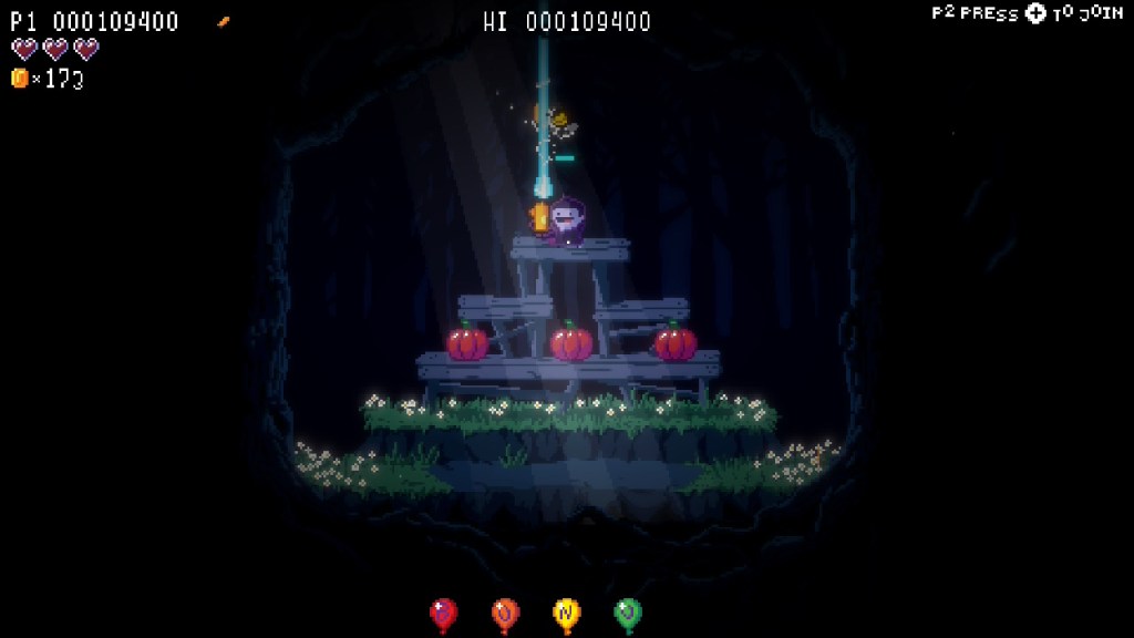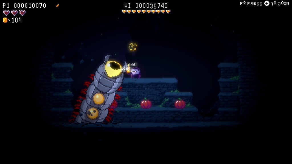I was only able to play in single player mode, so I played as Fang by default. (I couldn’t figure out if I could switch to Flora, so I don’t know if she has different abilities.) Bugs will descend from above and attempt to eat the pumpkins on the platforms in each level.