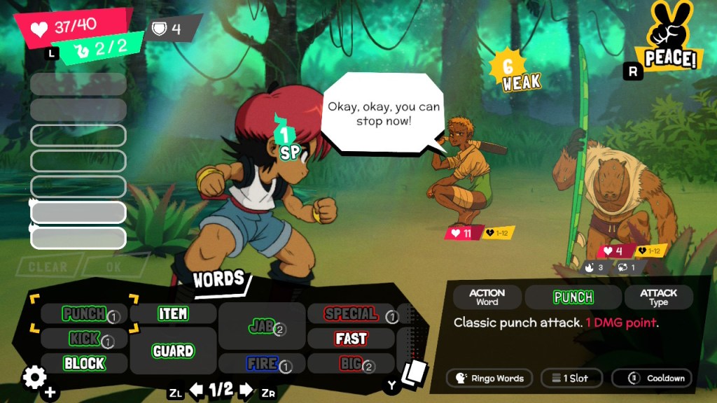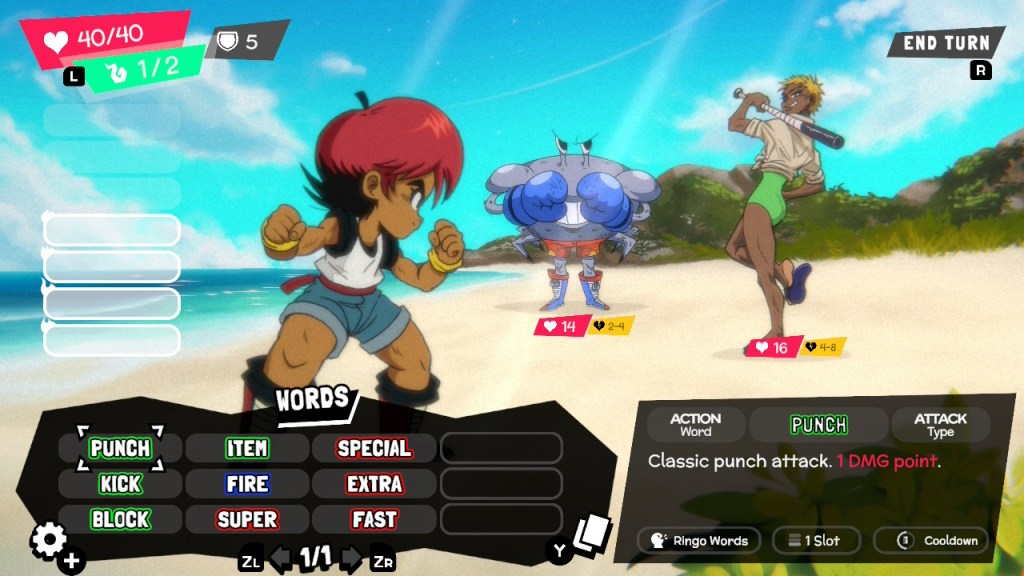 Ringo battles her opponents on each map by combining words into either offensive or defensive moves with some cool and/or silly names. For each turn you get to choose an action word (i.e. “kick”), an elemental word (“dragon”), and multiple modifier words (“super”).