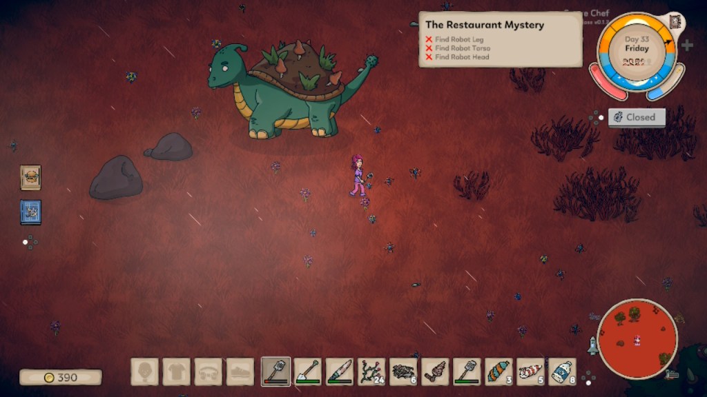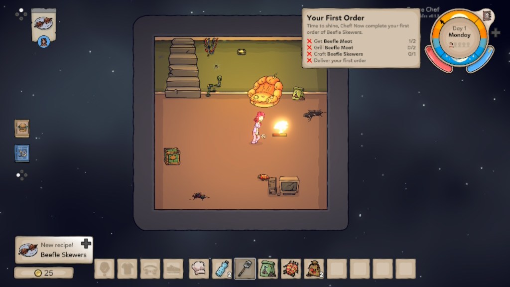 Your character has taken their grandma’s place as Chef of some sort of catering business in the area. You start out in a rundown space trailer with very limited resources. With nothing more than a spatula and a haphazardly put together grill, initially you only have some soil to plant one seed at a time as well as the ability to hunt the bugs down in your basement for free, quick, and easy ingredient sources.