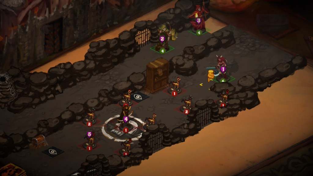 In each stage your team of 3 will start out in a small room, and you’ll have to click on the door to advance to the next room. Dungeons are full of traps, treasure, and enemies. There are often trap tiles in front of treasure, so you’ll have to decide if you think it’s worth a character potentially taking damage when they come with limited HP and healing opportunities. (The odds of trap damage is based on a unit’s “Save vs Traps” stat.)
