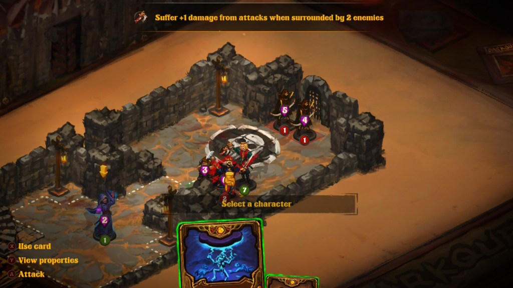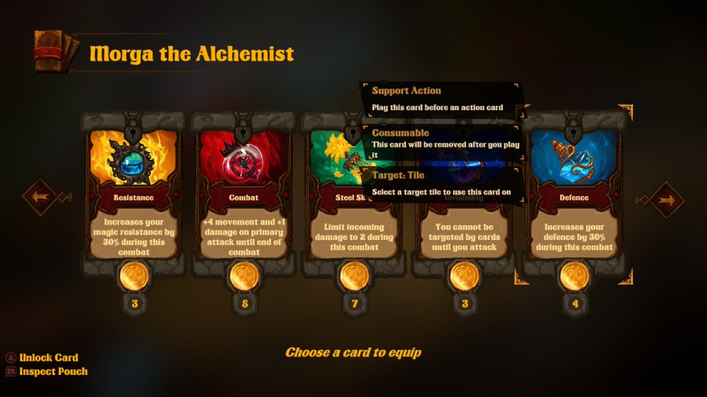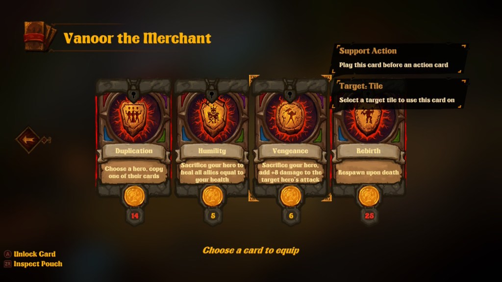 Each vendor sells a different type of card, like healing and buff cards or equipment cards. There are passive cards that give units the chance to trigger a second attack, or some other benefit. Support action cards are played before action cards for perks such as gaining another action in a turn. You have to purchase new cards using the coins you’ve obtained from the dungeons, but you can only equip each card on one unit.