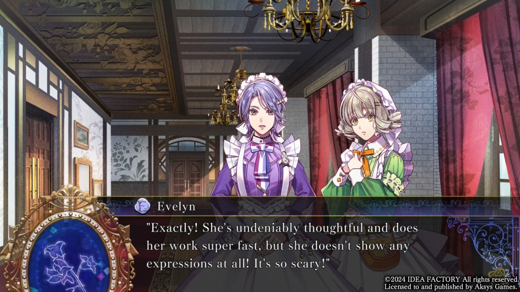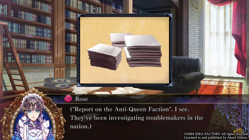 Besides the standard intel gathering methods, Rose also has the ability to see echoes of memories and feel the emotions felt by the owner of the memory. A large part of the common route chapters consists of snooping exploring the household to locate shards that, when combined, allow you to view conversations people would have been careful not to have in front of Rose or other staff members.