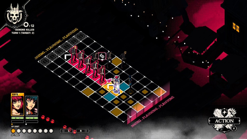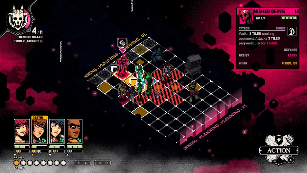 Alternatively, you could have 2 characters act twice to use 6 AP, which again would leave 2 AP for 2 more characters to act once. You can experiment with different strategies as much as you want in the planning phase thanks to the rewind button, which can be used as much as you’d like (in the planning phase).