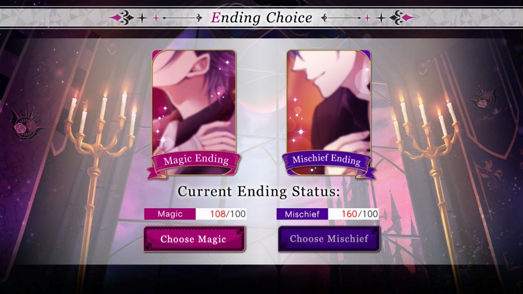 Each love interest’s route contains 30 chapters in this volume, and 3 of them have additional “premium” scenes. There are 2 endings in each route: a “Magic” ending and a “Mischief” ending. You make a dialogue choice once per chapter, and each option gives you a certain number of points toward the endings. (Check out our walkthroughs here!)