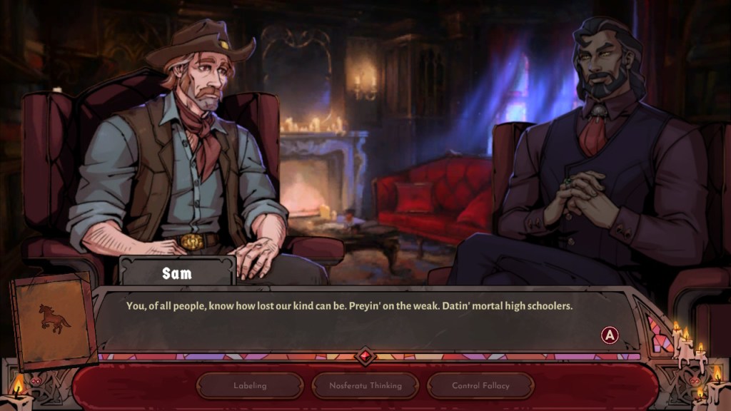 The game opens with a brief introduction from main character Sam, a cowboy-turned-vampire who became interested in improving himself as well as helping other troubled vampires. He travels to Germany to learn from Andromachos (“Andy”), the vampire who is apparently the only vampiric therapist in existence.