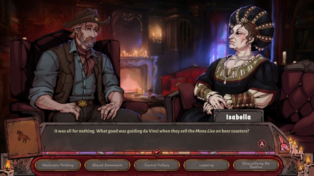 These issues did detract from the game for me, but I still enjoyed learning about the clients’ issues. This game is really cool on multiple levels because not only did they seek advice from real licensed therapists, but they also took inspiration from historical figures for some of Sam’s clients. I loved checking out the references listed in the credits!