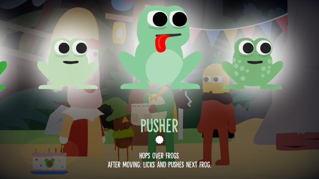 The first part of the game helps you get used to the mechanics of Frogtime. At first I’d assumed that the rules were the same as in checkers, and that a frog would be “captured”/removed once you jumped over it. But here all frogs remain on the board until they get to the other side (with the exception of the fragile toad, which gets destroyed if they run into another frog).