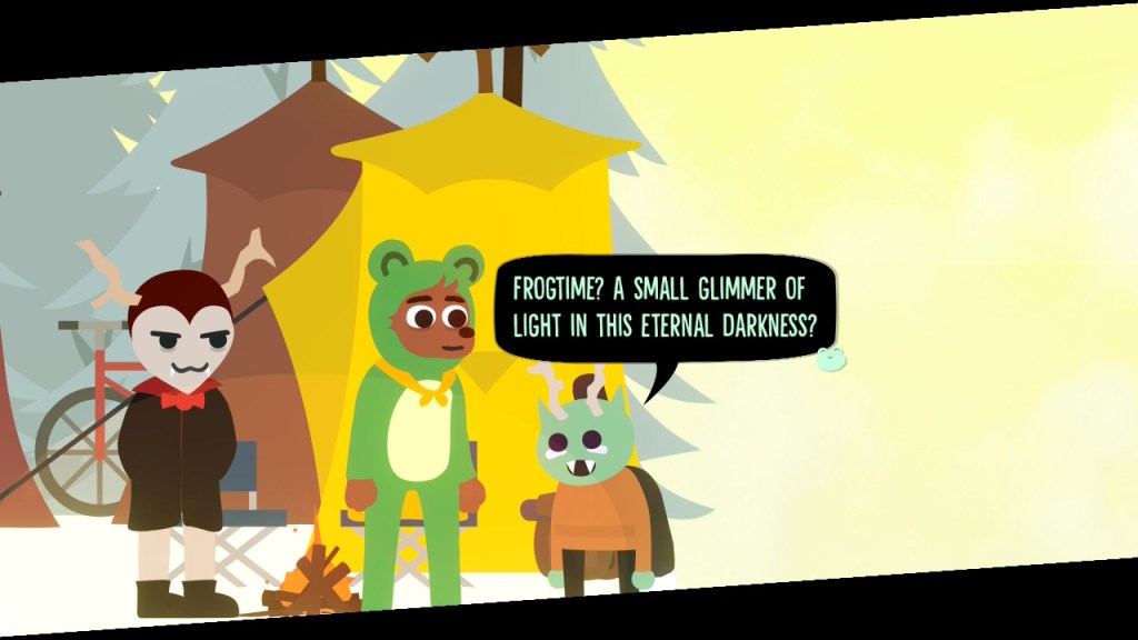 Some plot points felt unresolved. (What happened to Bonnie last year? What was with the tower?) But the writing overall is silly and clever, and I love the puns. Regardless of each character’s motivations, in the end everything comes down to Frogtime. The game has a wholesome message about the way that games like Frogtime – or even just hobbies in general – connect us and bring us out of our shells.