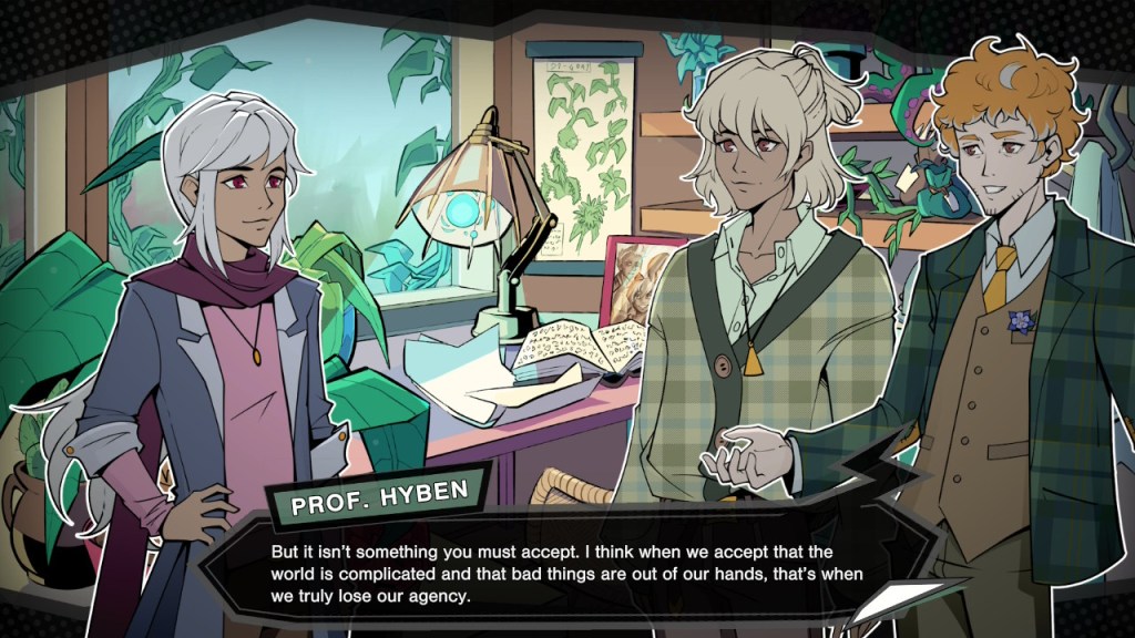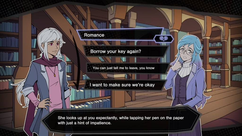Certain actions may become available in a scene depending on the academic track you’ve chosen. For example, selecting mending as your major allows you to heal someone if they’re injured in that scene.