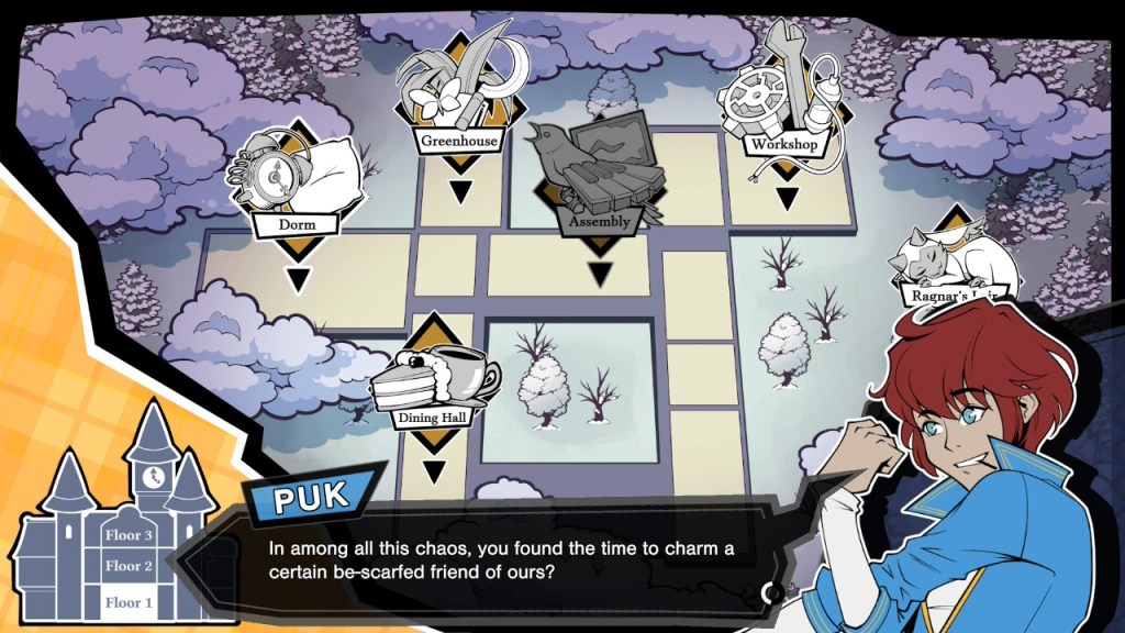 The conflict in the story starts with academic concerns, but it grows from there. You have to click on areas of the academy map to speak with the characters there, and make dialogue choices with different emotions associated with them. I enjoyed this dialogue system in the last game as well because it lets you have more control over the way your character develops.
